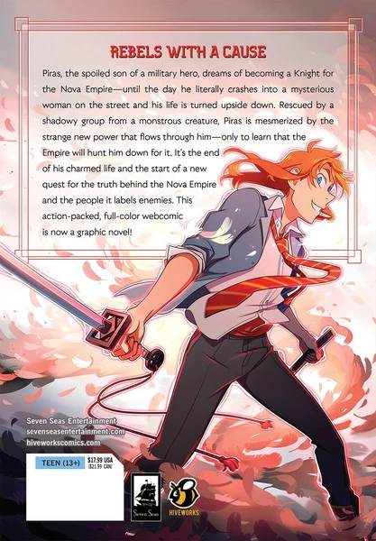 Piras, the spoiled son of a military hero, dreams of becoming a Knight for the Nova Empire–until the day he literally crashes into a mysterious woman on the street and his life is turned upside down. Rescued by a shadowy group from a monstrous creature, Piras is mesmerized by the strange new power that flows through him—only to learn that the Empire will hunt him down for it. It’s the end of his charmed life and the start of a new quest for the truth behind the Nova Empire and the people it labels enemies. This action-packed, full-color webcomic is now a graphic novel!